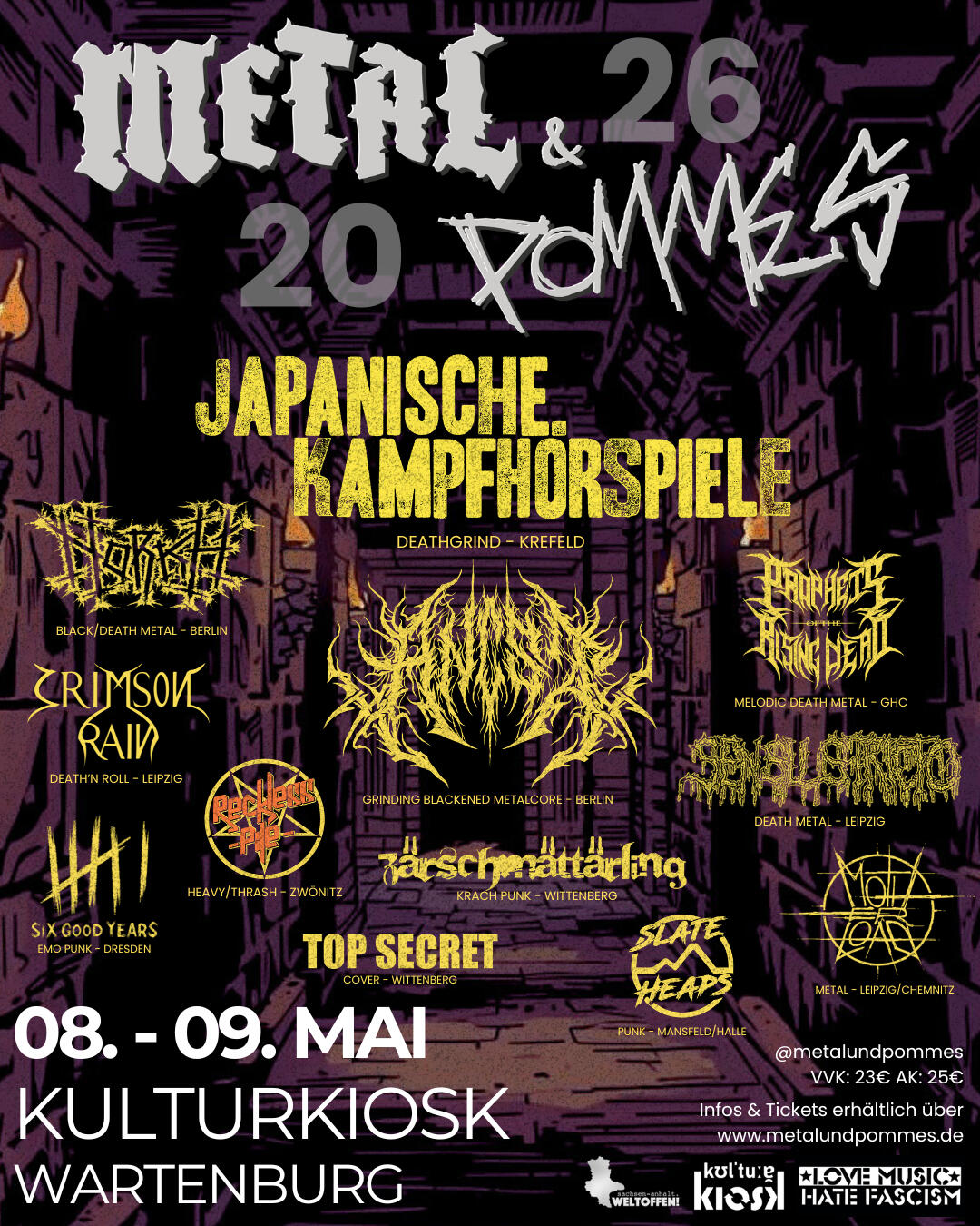 Willkommen beim Metal & Pommes Festival! Das Event findet vom 8. bis 9. Mai 2026 im Kultur Kiosk in Wartenburg statt. Freut euch auf ein Wochenende voller kreativer Auftritte mit über 10 Bands, die für beste Stimmung sorgen. Für alle, die das Festival noch intensiver erleben möchten, steht Camping direkt an der Location bereit. Infos, Tickets oder Impressionen findet ihr direkt hier auf der Website.