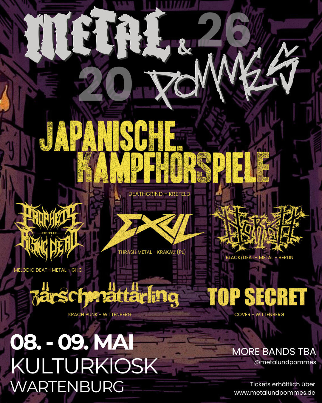 Willkommen beim Metal & Pommes Festival! Das Event findet vom 8. bis 9. Mai 2026 im Kultur Kiosk in Wartenburg statt. Freut euch auf ein Wochenende voller kreativer Auftritte mit über 10 Bands, die für beste Stimmung sorgen. Für alle, die das Festival noch intensiver erleben möchten, steht Camping direkt an der Location bereit. Infos, Tickets oder Impressionen findet ihr direkt hier auf der Website.